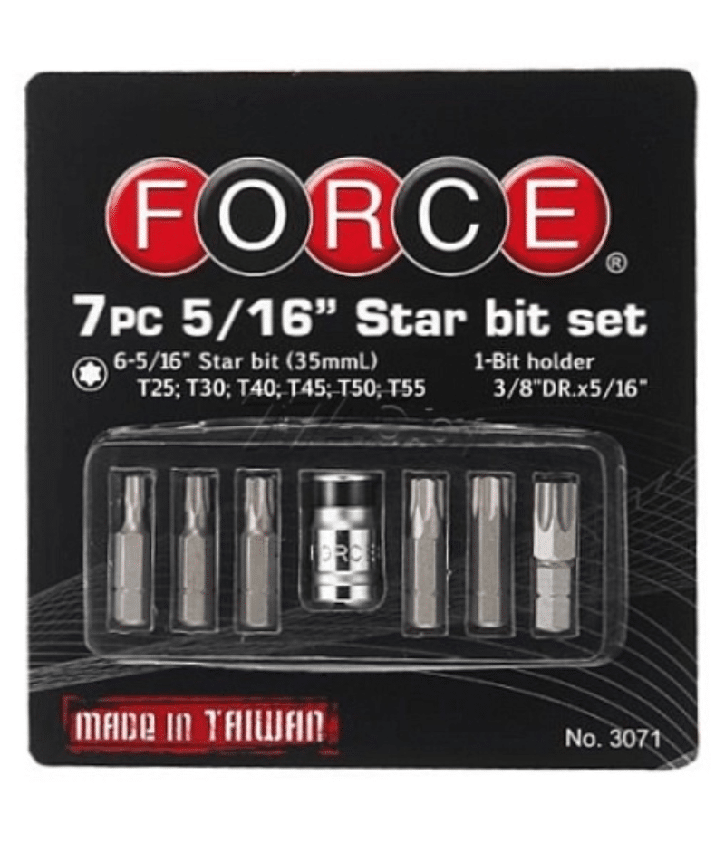 The FORCE 7PC 5/16" STAR BIT SET T25-T55 is a professional bit solution designed for reliable engagement and long service life.